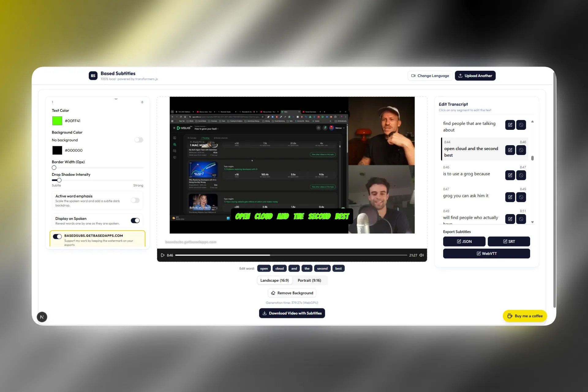 No cloud. No uploads. No tracking. The AI models download once, then everything runs locally using WebGPU and WebAssembly. Your video files never leave your machine.